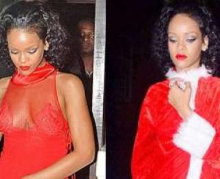 25-летняя исполнительница надела к подруге на тематическую рождественскую вечеринку в нижнем белье, которая проходила в ночном клубе на Барбадосе, весьма пикантный наряд, поначалу прикрытый "пальтишком" Санты.