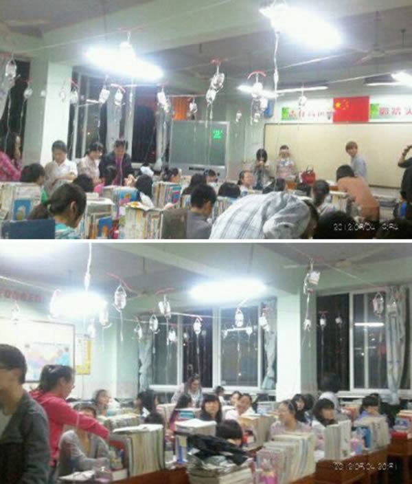 Подростки из школы Сяогань (Xiaogan High School) из провинции Хубей (Hubei) были запечатлены в тот момент, когда они готовились к экзамену под капельницами.