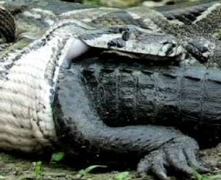 Я думал что у крокодилов естественных врагов нет, они сами кого хочешь сожрут. Но вот питоны не упустят случая закусить крокодильчиком, особенно молоденьким. Молоденькое мясо легче усваивается. Кстати, данная трапеза происходит во Флориде - чего там только не увидишь.
