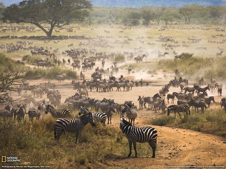 Национальный парк Серенгети в Танзании является одним из самых старых и самых известных заповедников дикой природы в Африке. Парк славится ежегодной миграцией миллионов гну плюс сотен тысяч газелей и зебр, за которыми следуют хищники, что представляет собой одно из самых впечатляющих природных зрелищ в мире. Великая миграция, которая представляет собой ежегодный 1000-километровый круговой поход, происходит в уникальной живописной местности, на обширных безлесных просторах впечатляюще плоских травянистых пастбищ, усеянных скальными выступами пород вперемешку с реками и лесами. В парке также наблюдаются одни из самых впечатляющих и разноплановых биологических отношений крупных хищников и их жертв в мире.