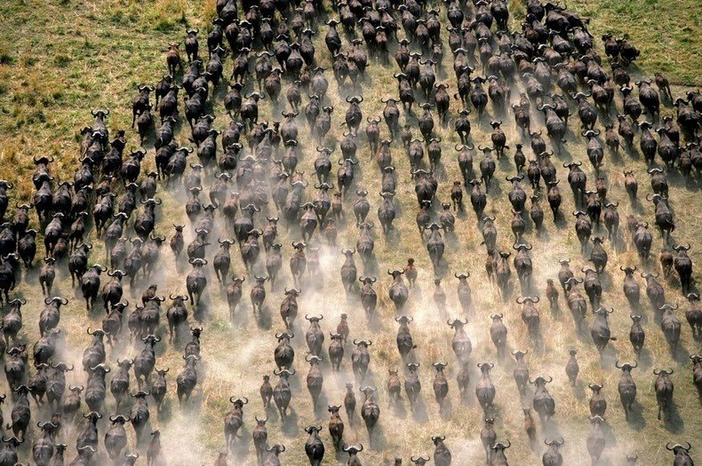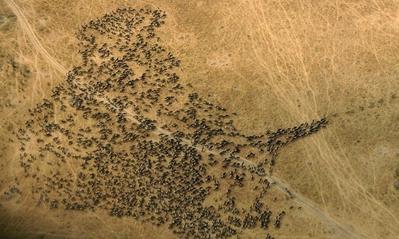 Аэрофотосъемка стада гну, следующих за несколькими ведущими зебрами, в Масаи Мара.
