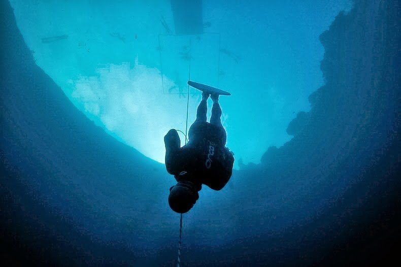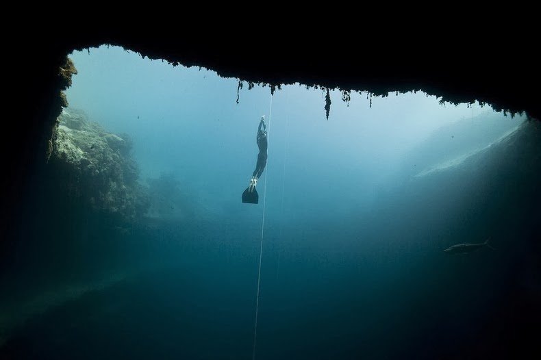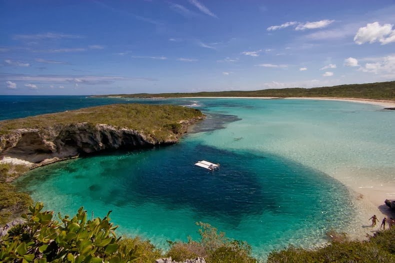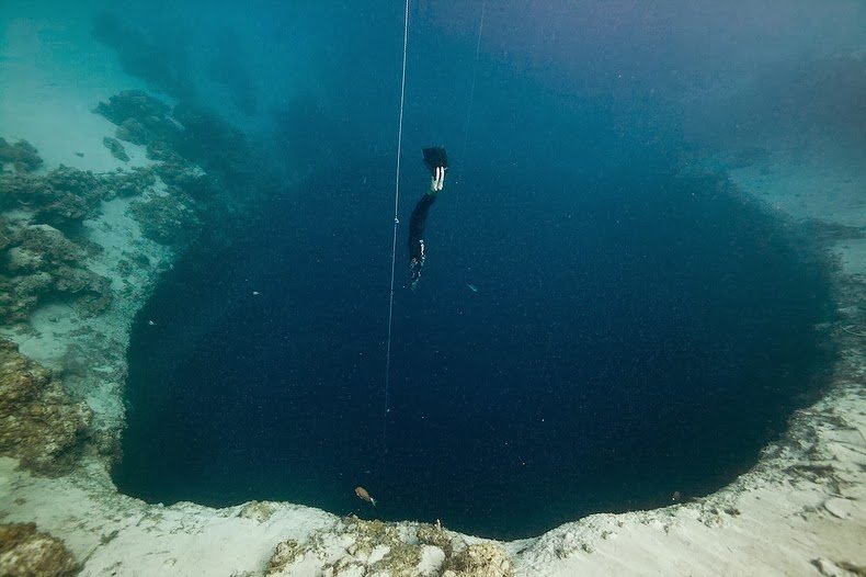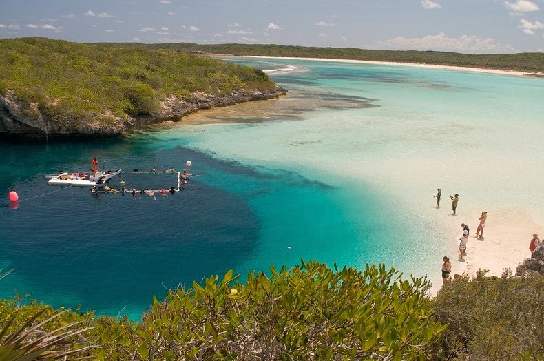 Голубая дыра Дина (Deans Blue Hole), расположенная рядом с городом Клэренс Таун (Clarence Town) на острове Лонг-Исланд (Long Island), Багамские острова, является самой глубокой известной «голубой дырой» - определение, которое даётся любой глубокой, заполненной водой, вертикальной пещере или воронке, вход в которые находится под поверхностью воды. В то время как максимальная глубина большинства голубых дыр и воронок составляет порядка 110 метров, глубина Голубой дыры Дина равна более чем 200 метрам, что делает её довольно уникальной. На поверхности Голубая дыра Дина выглядит приблизительно круглой, с диаметром варьирующим от 25 до 35 метров. После спуска на 20 метров, отверстие значительно расширяется, образуя пещеру диаметром 100 метров.