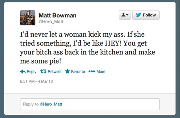 В ноябре 2012 года в твите, отправленном с аккаунта Мэтта Боумана (Matt Bowman), @ Hero_Matt, было написано следующее: «Отвергните женщину, и она никогда вам этого не спустит. Один из многих дефектов их пола. Кроме того, у них слабые руки». В твите, отправленном с того же аккаунта в марте 2013 года, было написано: «Я никогда не позволю женщине надрать мне задницу. Если она попытается сделать что-то в этом роде, я скажу ей - ЭЙ! Ну-ка отправь свой сучий зад обратно на кухню и сделай мне пирог!».