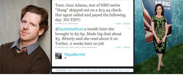 В 2009 году Джейн Адамс (Jane Adams), звезда телесериала «Жеребец» на канале HBO, заказала суп и лимонад в заведении Барни Гринграсс (Barney Greengrass) в Беверли Хиллз. Сумма её заказа была вполне разумной и составила всего 13,44 доллара. Будучи не в состоянии оплатить счёт, Адамс объяснила, что оставила кошелёк в машине и сказала, что сходит за ним, но так и не вернулась. Раздосадованный официант по имени Джон-Баррет Ингельс (Jon-Barrett Ingels), который обслуживал её, твитнул об этом казусе.