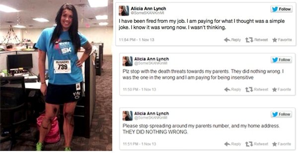 В ноябре 2013 года 22-летняя Алисия Энн Линч (Alicia Ann Lynch), была уволена после того, как она твитнула и выложила на Instagram фотографию себя, вырядившейся как жертва взрывов на Бостонском марафоне для Хэллоуина. Вскоре после того, как она выложила фотографию на Твиттер, бестактный и оскорбительный твит вызвал огромное количество ярости в Интернете.