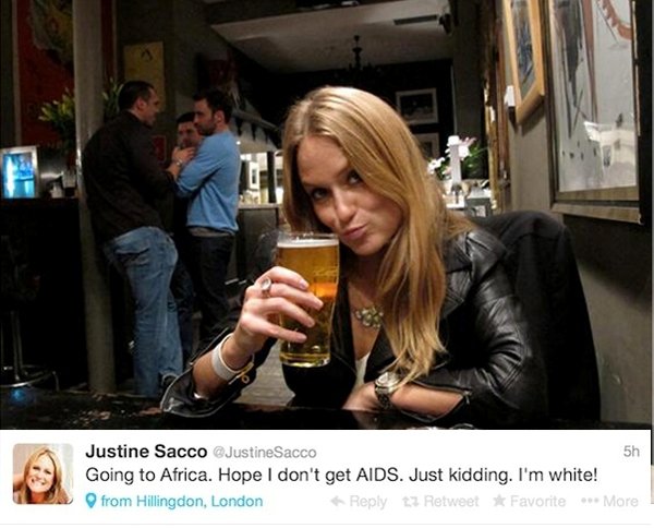 В декабре 2013 года Жюстин Сакко (Justine Sacco), директор по коммуникациям из нью-йоркской интернет корпорации Empire Interactive была уволена после того, как она послала глупый и расистский твит перед посадкой на рейс из Лондона в Кейптаун (Cape Town). В нём значилось следующее: «Лечу в Африку. Надеюсь, что не заражусь СПИДом. Шутка. Я ведь белая!».