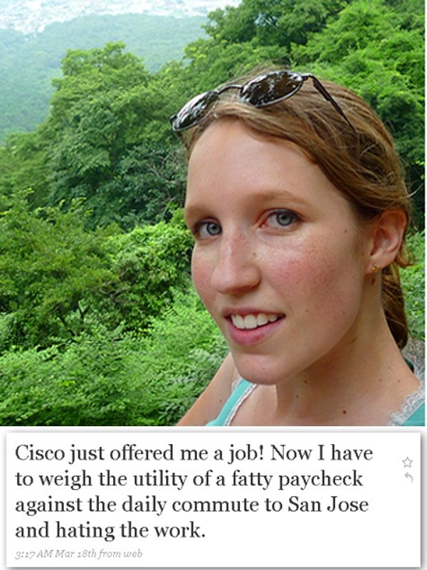 В марте 2009 года у Коннора Райли (Connor Riley) было предложение о работе от Cisco. К сожалению, степень магистра Райли в области управления информацией и системами в Университете Калифорнии, Беркли, не предотвратила её неразумное управление собственной информацией на Твиттере. Она твитнула: «Cisco только что предложили мне работу! Теперь я должна взвесить целесообразность большой зарплаты с ежедневными поездками в Сан-Хосе и ненавистью к своей работе». Вскоре после этого, она получила ответ от сотрудника Cisco Тима Левада (Tim Levad), который предложил передать её чувства менеджеру по найму персонала. Понятное дело, что Райли потеряла работу, даже не приступив к её выполнению.