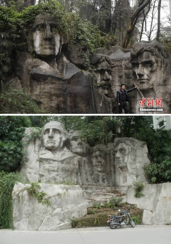 Высота знаменитых лиц четырёх американских президентов, высеченных в горе Рашмор, Южная Дакота оставляет порядка 18,6 метра. Эта реплика не настолько большая, но всё же монументальная по своим масштабам. Она расположена в парке города Чунцин, который был столицей Китая с 1937 по 1945 год.