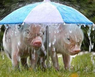 Пара поросят укрываются от дождя под зонтиком.