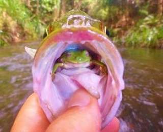 Австралийскому рыболову Ангусу Джеймсу удалось поймать необычную добычу. Когда он вытаскивал крючок из пасти выловленного окуня, во рту у рыбы обнаружилась отдыхающая древесная лягушка со счастливой миной.