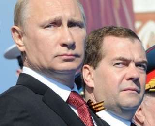 Президент России Владимир Путин (слева) и премьер-министр Дмитрий Медведев принимают участие в параде Победы на Красной площади в Москве 9 мая 2014.