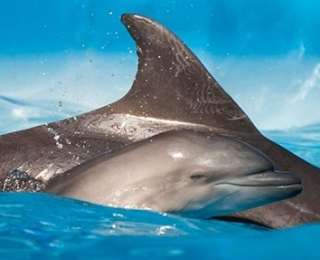 Новорожденный дельфин плывет со своей матерью во время выступления дельфинов в дельфинарии в Донецке.