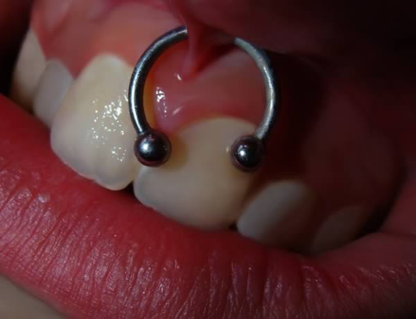 Вампирским называют пирсинг уздечки верхней губы, той ткани, которая соединяет верхнюю губу и ваши дёсны. Независимо от того, являются ли ваши зубы заострёнными или нет, этот пирсинг, по правде говоря, немного жутковатый, но все же интересный и довольно визуально привлекательный. Тем не менее, при этом виде пирсинга необходимо соблюдать осторожность, чтобы избежать истончения тканей и дёсен в той области рта, где располагается этот пирсинг.