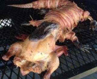 От одного вида этого монстра, с ног до хвоста завёрнутого в бекон и с целой курицей в зубастой пасти можно и аппетит потерять.