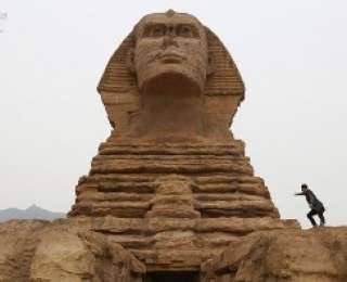 Мужчина фотографируется возле копии Сфинкса на окраине Шицзячжуаня.