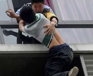 4. Полицейский хватает человека, который пытался спрыгнуть с седьмого этажа гостиницы в Чэнду в Китае, 20 мая 2014. (Фото: Reuters)