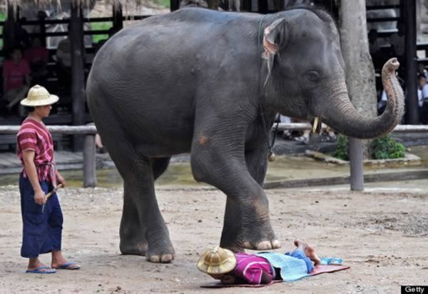 Если вы чувствуете напряжение в поясничной области, для вас есть идеальный массажист - СЛОН. Трёхтонный зверь был обучен, мягко нажимать ногой на спину своего тренера, чтобы быть в состоянии выполнять эту нелёгкую задачу в туристическом парке в Чианг Май (Chiang Mai), Таиланд. Представители общественности также могут добровольно лечь, если они хотят почувствовать на себе этот необычный вид массажа.