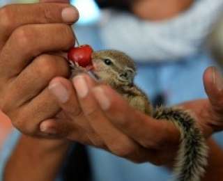 10. Осиротевший в результате страшной грозы бельчонок лакомится вишней из рук человека. Зверек был спасен из завалов упавших деревьев жителями Нью-Дели. (Getty Images)