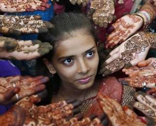 2. Школьники показывают разрисованные хной руки во время празднования Всемирного дня народонаселения в Ахмедабаде, Индия. (© Амит Дэйв / Reuters)
