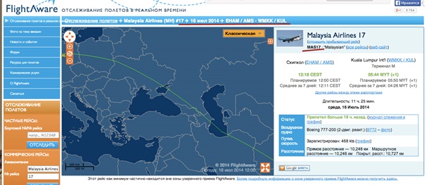 Это маршрут самолета, который летел из Амстердама в Куала-Лумпур Малазийскими авиалиниями, рейс 17 16 июля. Время вылета из Скипхола 12:10.