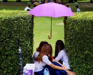 Женщины сидят в тени зонтика в общественном парке солнечным днем в Янгон, Мьянма, 3 июня 2014 года.