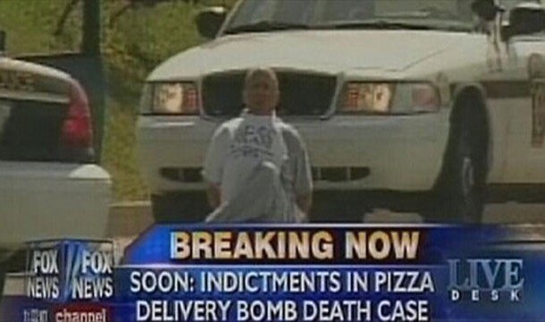Когда доставщик пиццы Брайан Уэллс (Brian Wells) был остановлен полицией посреди ограбления банка, никто не поверил его истории о том, что его заставили это сделать какие-то люди, которым он доставил пиццу. Он продолжал умолять офицеров полиции, говоря, что его колье было бомбой. К сожалению для него, сапёры не появились вовремя.