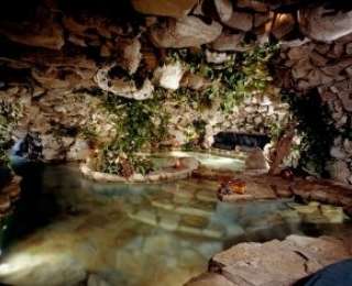 Что можно ещё хотеть от бассейна, если в нём есть водопады, железные факелы, грот с баром, телевизор и пространство для отдыха?