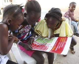 11. Девочки рассматривают плакат ЮНИСЕФ о профилактике вируса Эбола в городе Воинджама, Либерия, апрель 2014 года. Фото: Reuters Ahmed Jallanzo / UNICEF / Handout via Reuters