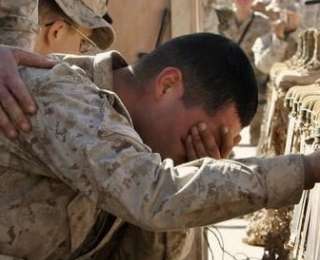 5. Американский морской пехотинец плачет на заупокойной службе по 31 убитому служащему в западном Ираке, 2 февраля 2005 года.