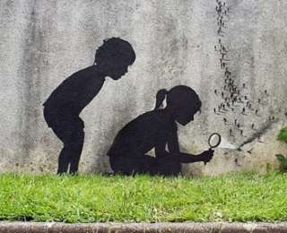 На другой работе испанского художника двое детей увлечены экспериментом с увеличительным стеклом, пытаясь поджечь муравьев солнечными лучами. Жестокая игра, столь популярная среди детей, познающих мир, становится еще более неоднозначной, ведь при ближайшем рассмотрении муравьи на стене оказываются маленькими человечками.
