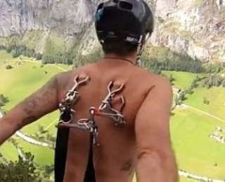 Экстремал и любитель модификаций тела Станислав Аксенов провернул трюк, от которого по коже бегут мурашки. Он прыгнул с парашютом, прицепленным к пирсингу в его спине с высоты в 400 метров. Кстати, это он же организовал прыжки со свободным падением на пирсинге.
