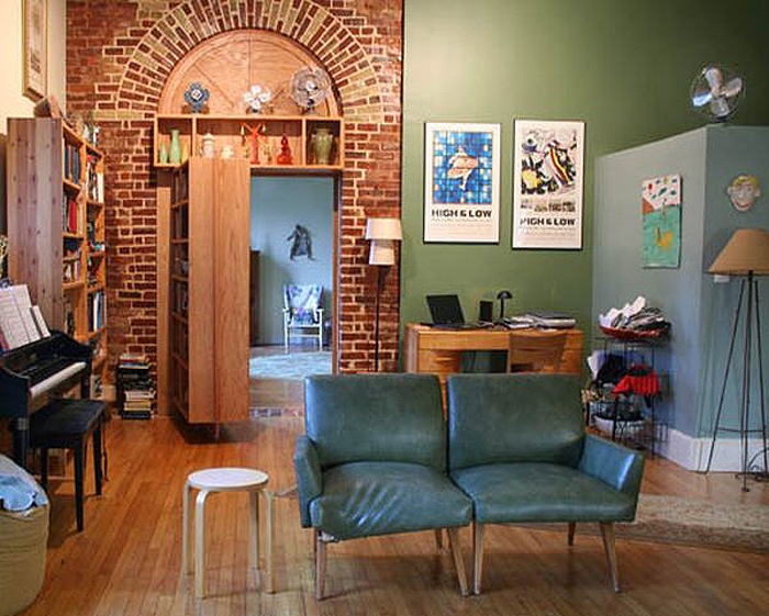 Книжный шкаф, выложенный крупным кирпичом, скрывает вход в спальню.