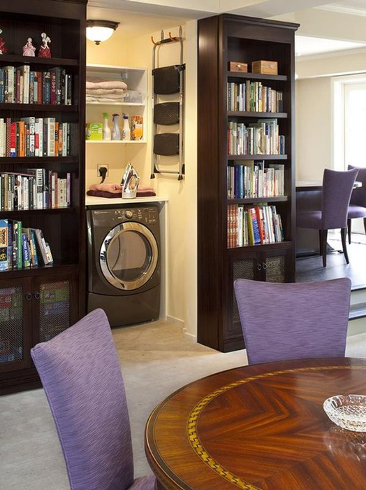 Раздвижной шкаф в гостиной скрывает миниатюрную прачечную – отличное решение для маленьких квартир.