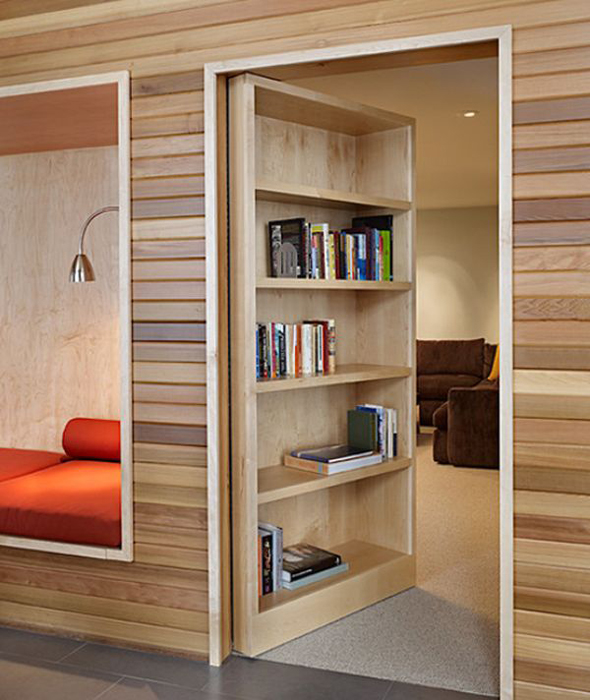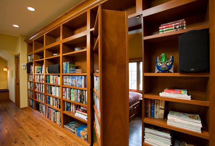 Обычный на первый взгляд книжный шкаф в современном доме является дверью, ведущей в кладовку.
