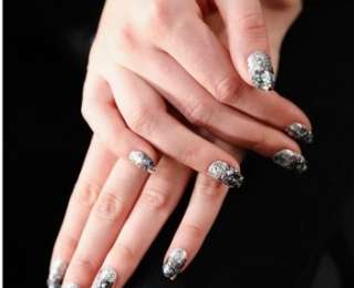 Еще один необычный вариант покрытия можно было увидеть на все том же показе Libertine. В первом случае им стало бесцветное покрытие с металлическими вставками и мини-цепями, наклеенными на ногти. Во втором варианте это плотное покрытие из лака с блестками в одной цветовой гамме с плавным переходом от мелких к более крупным стразам. Для такой техники вам понадобится два вида лака: сначала накрасьте ногти покрытием с мелкими еле заметными блестками, а сверху, пока лак полностью не высох, на кончик ногтя нанесите лак с более заметными блестящими составляющими.