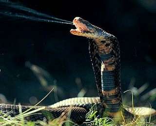 Среди «стреляющих» змей наиболее известны африканские плюющиеся кобры. При угрозе они, защищаясь, выплевывают на расстояние 2-3 метра струю яда. Перед «выстрелом» кобра начинает крутить головой и, выплескивая яд по касательной, целится в основном в глаза, поражая их с завидной точностью.