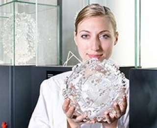 В Микропии демонстрируются стеклянные модели различных вирусов. На фотографии сотрудник лаборатории держит модель ВИЧ, а справа виден знаменитый вирус Эбола.