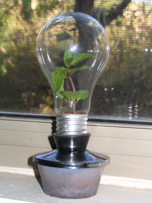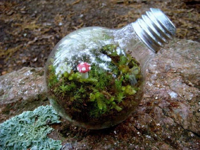 В старой стеклянной лампе можно создать маленький террариум, насыпав внутрь немного влажной земли и посадив туда мох.