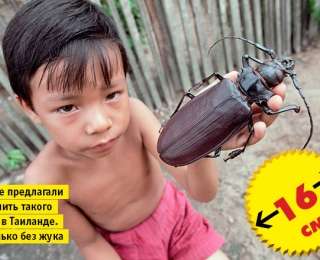Ребенок и не подозревает, как зовется то, что он держит в руках. Или, наоборот, это оно держит ребенка? Жук дровосек-титан испокон веков славится габаритами, и дорасти до 16 см для него не проблема. Живет жук в тропиках и для человека совершенно неопасен. Повторяй это про себя, если обнаружишь такое в постели.