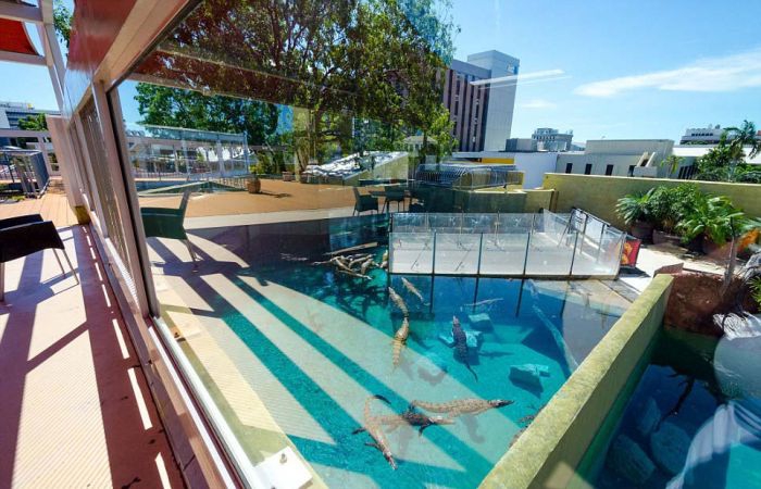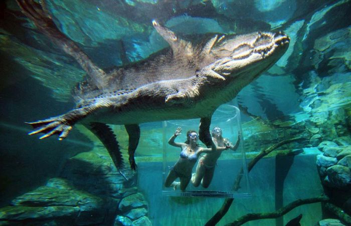 В австралийском городе Дарвин Сити есть аттракцион под названием Crocosaurus Cove, суть которого заключается в том, что вас в специальном защитном контейнере помещают в бассейн с огромным крокодилом. Длительность приключения – 20 минут. Здесь вам также предложат подводную съемку с древней рептилией и ее кормежку.