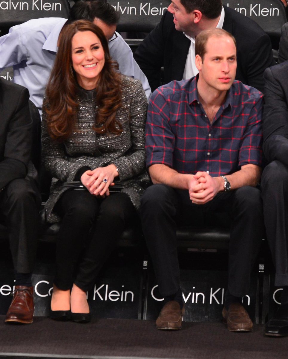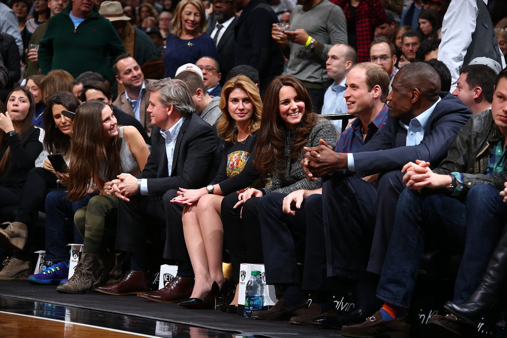 Бейонсе и Джей Зи, принц Уильям и Кэтрин на баскетбольном матче между командами Brooklyn Nets и Cleveland Cavaliers в Barclays Center в Бруклине. Перед этим пара посетила прием у британского генерального консула, где также присутствовали Хиллари и Челси Клинтон вместе с супругом Джоном Мезвински. На Кэтрин пальто от Tory Burch.
