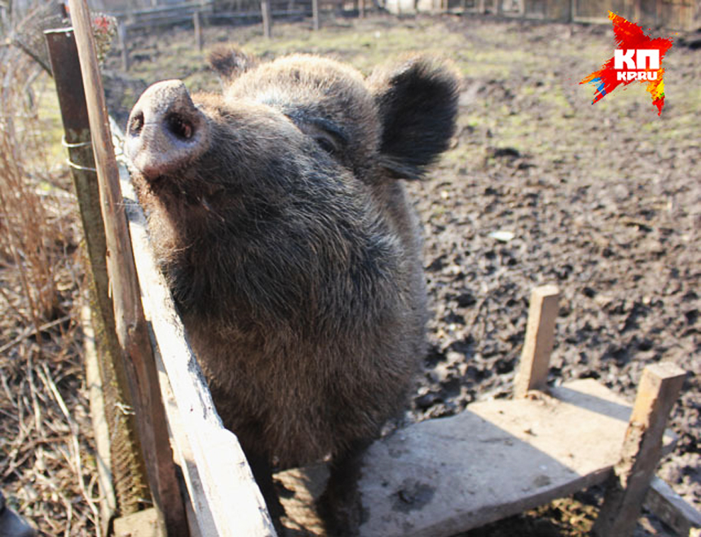 Кабаниха Маша живет в поселке Красный Смоленской области. Она ничуть не боится людей, но слушается только «хозяина» Виктора Новикова, с которым 150-киллограмовую хрюшку связывает трогательная дружба. Началась эта история шесть лет назад. Как-то раз Виктор нашел в лесу двух кабанят – один был мертвый, а другой живой. «Я, конечно, сначала подумал, посмотрел по сторонам, подождал, вспоминает Виктор. – Но кабаниха так и не пришла, и я забрал малышку домой» (подробности).