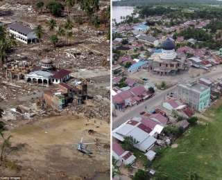 Во время цунами 2004 года, обрушившегося на Юго-Восточную Азию погибло около 200 тысяч человек в 14 странах. Больше всех от цунами пострадала Индонезия, в одной которой погибло более 130 тысяч человек и более полумиллиона людей остались без своих домов. Предлагаю вам посмотреть на сравнительные фотографии чудесного преображения практически полностью разрушенной Индонезии спустя 10 лет после трагедии.