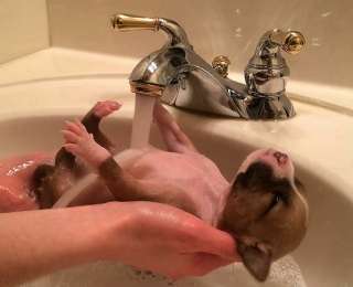 13. Очаровательного щенка купают под краном в Далласе, штат Техас. Сотрудники Далласского ветеринарного центра нашли в мусорном баке несколько щенков, которых отправили в приют для животных «Спасите меня», где Клэр Фаулер внимательно заботится о них. (© Barcroft Media)