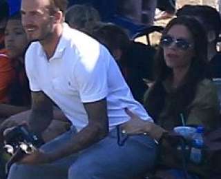 Видимо, Дэвид и Викки немного опоздали на начало футбольной игры и поэтому им достался всего один стул. Предприимчивый Дэвид тут же усадил на него свою благоверную, принес ей содовую в стаканчике, а сам уселся сверху на хрупкую и очень худенькую Викки. Однако, поведение любимого ничуть не смутило миссис Бекхэм и она привычно обняла его за талию, чтобы в самый ответственный момент игры, переживающий за своих сыновей Бекхэм не сверзился с неустойчивого "сидения".