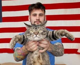 Андрей позирует со своим котом по кличке Соленый Огурец в своем доме в Бостоне, штат Массачусетс. Котяра весит 9 с половиной килограммов и в длину достигает 101 сантиметр. Говорят, это самый длинный кот в Америке.