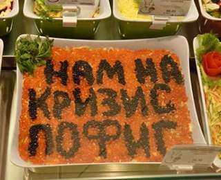 «Антикризисный» салат поступил в продажу в одном из продуктовых магазинов Екатеринбурга. Каждая порция покрыта слоем красной икры, поверх которого с помощью черной икры нанесена надпись, сообщающая о равнодушном отношении его производителей и покупателей к экономическим трудностям.