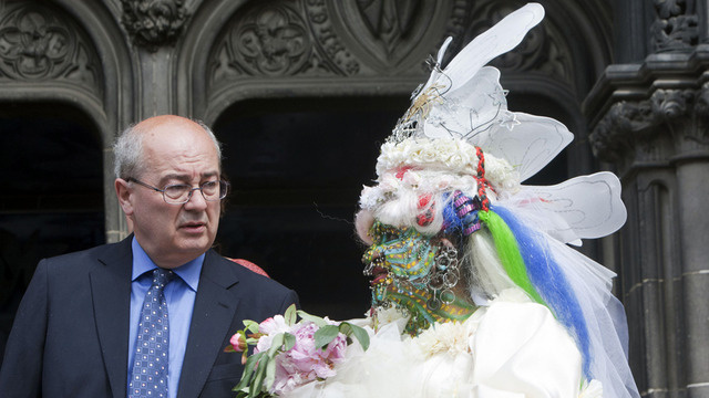 Супругом данной "очаровашки" стал некий Douglas Watson (Дуглас Ватсон),у которого на теле нет ни единой татуировки или пирсинга (да и зачем ему? на теле "молодой" на десяток мужиков этих железок хватит). На церемонию бракосочетания Элайн постаралась получше принарядиться: пышное белое платье, боевой раскрас индейца на тех участках лица, где еще нет железа (хотя мне, грешным делом, при первом взгляде на красотку подумалось о том, что это татуировка), и "головной убор", изготовленный из цветов, звёздочек и крыльев (воистину - "чудо в перьях"). Жених был в строгом тёмно-синем костюме, с синей же рубашкой и галстуком).