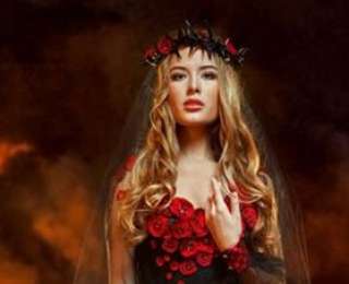 Платье, демонстрирующее красоту ног "невесты войны" мировым элитариям, выполнено в двух цветах траура – черном и красном – и украшено красными маками, которые являются символом наркотического забытья. Маки украшены сотнями кристаллов Сваровски, которые должны продемон Головной убор авторства Юлии Вирц, завершающий образ – терновый венок с красными маками и черной фатой.