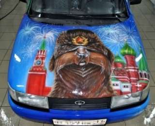 На капоте авто изображен медведь в ушанке и кремль, на крыше – карта США, которую с воздуха бомбит русский самолет, и надпись «Гудбай, Америка», сзади – стилизованная надпись «Мы русские! С нами Бог!», по правому боку машины – медведь, атакующий орла, на фоне горящего американского флага, а по левому, со стороны водителя, - задорный Путин рядом с приунывшим Обамой.